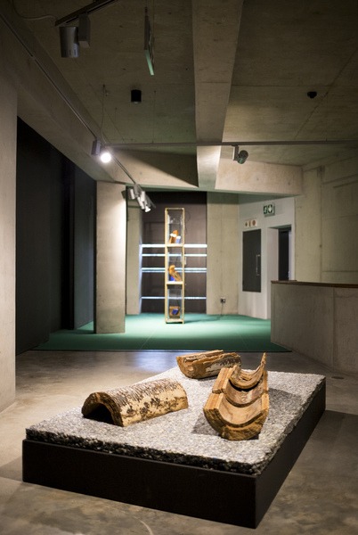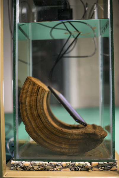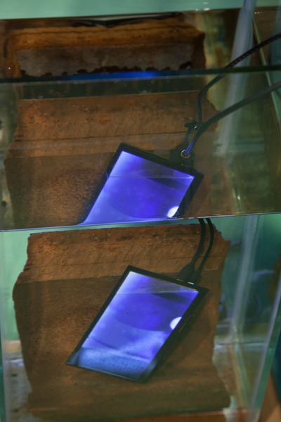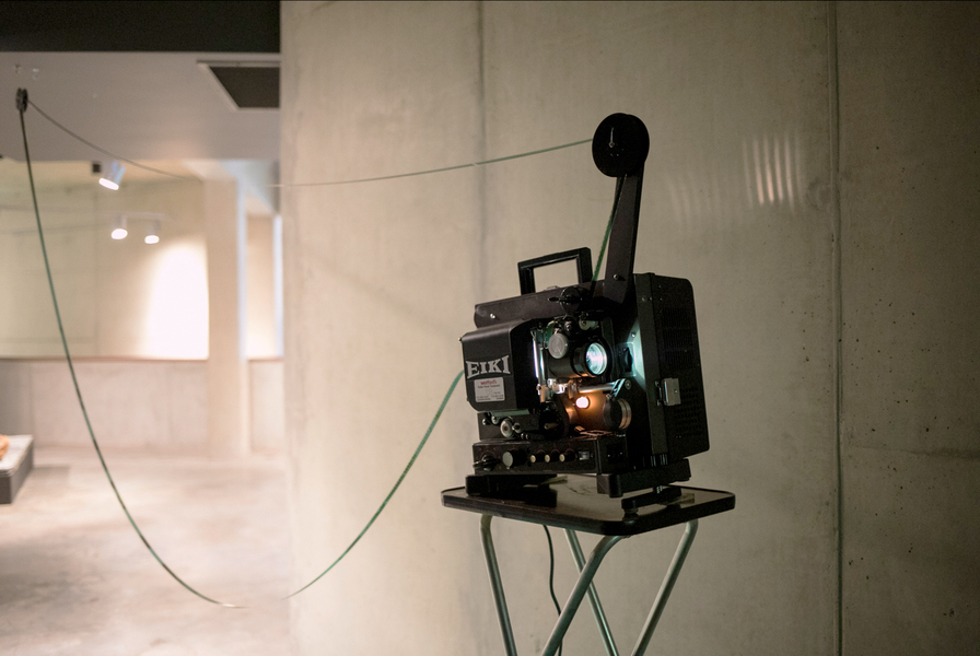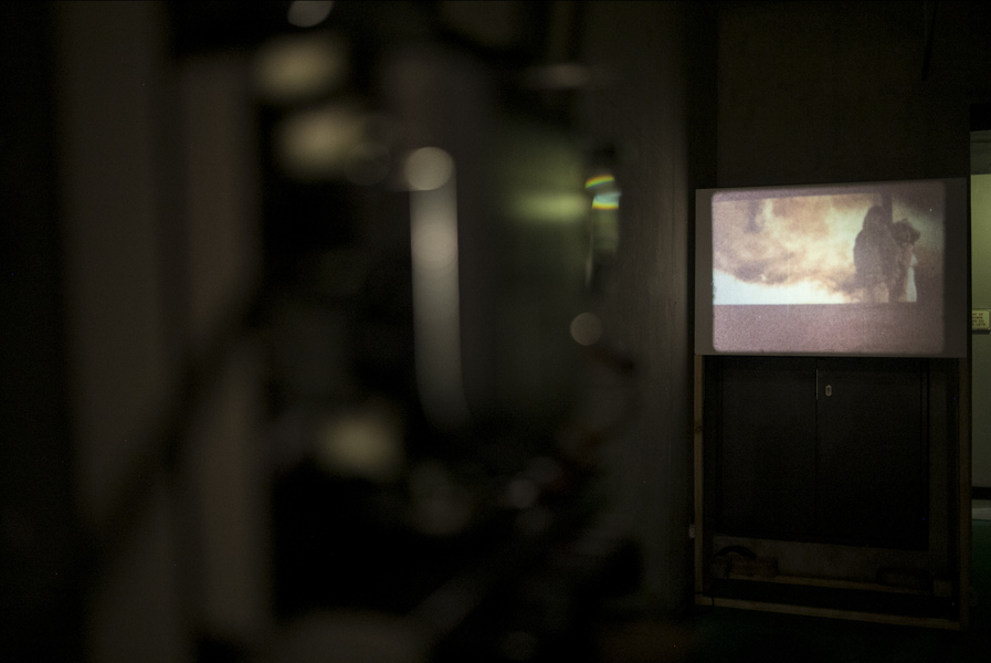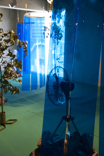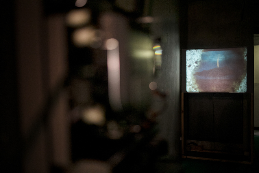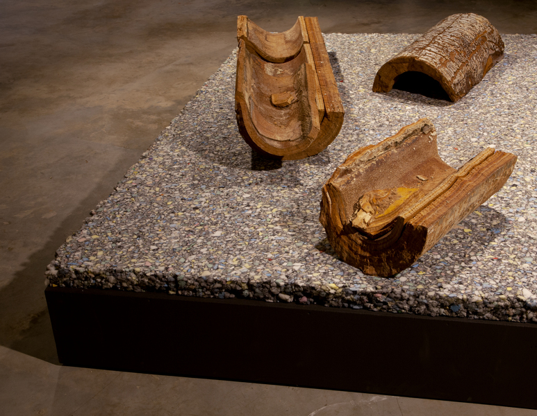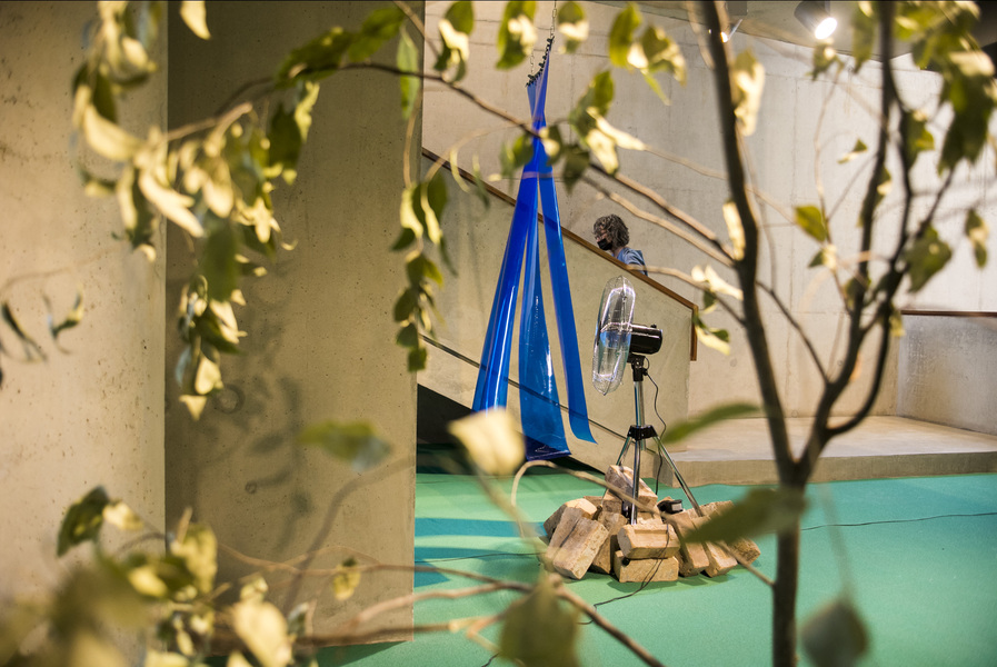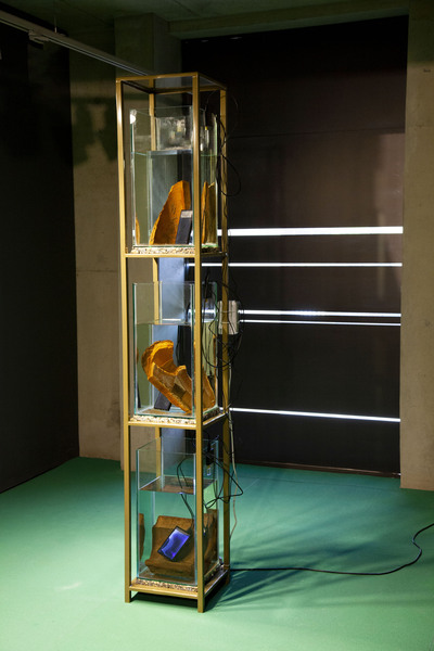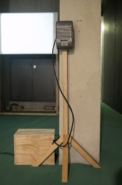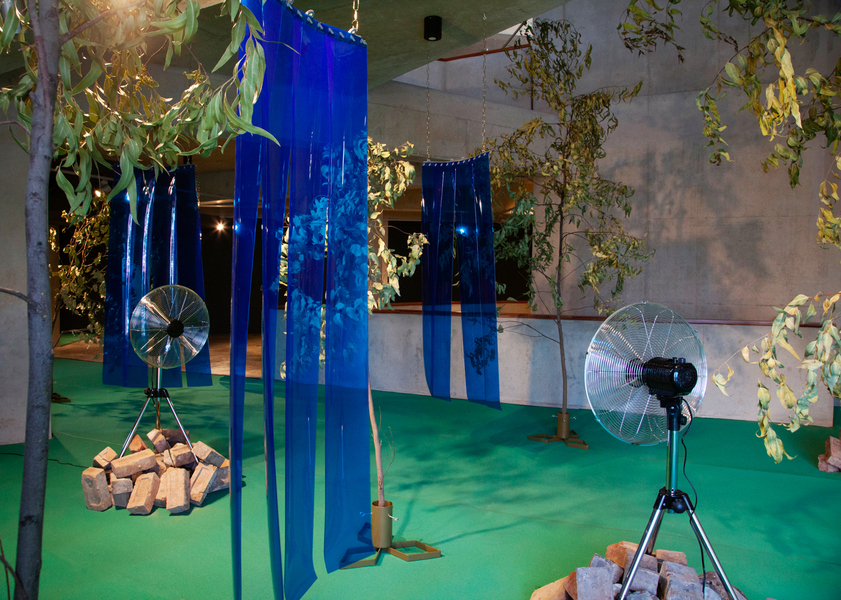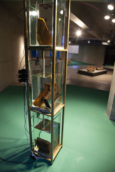 Barnett and Bolen approach this installation using research and materially investigative methods. In recognition of Top Star Drive-in (an outdoor Johannesburg cinema located on a mine dump), a 16mm film loop of Indiana Jones and the Raiders of the Lost Ark, marked by mine dust radiation, brings attention to the casual colonialism and plundering popularized by American cinema in the 1980s. A tower of mineral oil (in a form inspired by neutrino particle detectors) holds fragments of heavy metal deposits created by the mining process. These fragments read as strata in rock, or petrified trees, subverting the visual understanding of that which is natural or ancient (and similarly, that which is toxic and contemporary). Suspended rubber curtains and blue gum trees move by means of human activated fans, bringing awareness to the systems that circulate dust around the world and the impact on our bodies of these cycles.